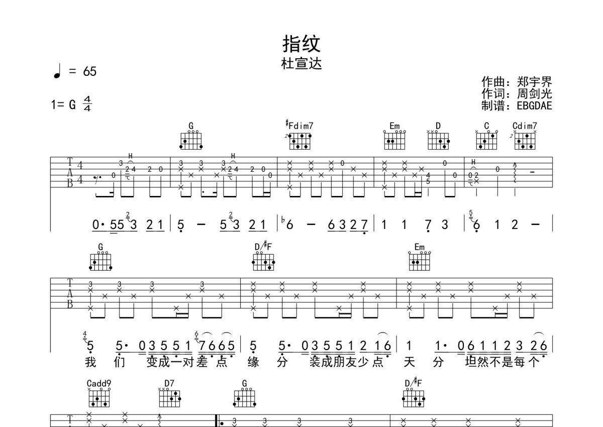杜宣达《指纹》吉他谱 - G调弹唱六线谱