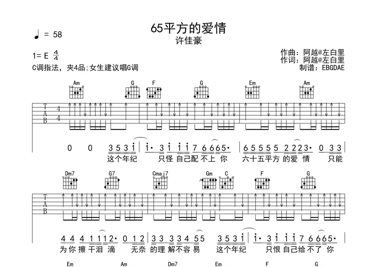 《65平方的爱情》是许佳豪演唱的一首歌曲,本吉他谱采用的是C调指法编配,这份吉他谱共有三张高清图谱,图谱由 @EBGDAE 编配上传,图谱使用六线谱编配,包含吉他和弦指法、简谱以及歌词部分,曲谱配备了相关的音频提供试听,使用这份65平方的爱情吉他谱,可以让你更加方便地掌握这首歌曲的弹唱技巧,快来尝试吧。扫弦原版。