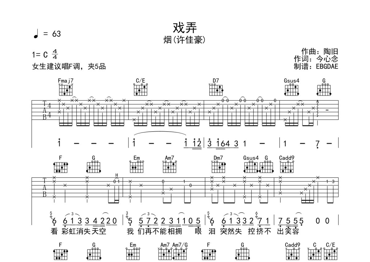 《戏弄》是烟(许佳豪)演唱的一首歌曲,本吉他谱采用的是C调指法编配,这份吉他谱共有三张高清图谱,图谱由 @EBGDAE 编配上传,图谱使用六线谱编配,包含吉他和弦指法、简谱以及歌词部分,使用这份戏弄吉他谱,可以让你更加方便地掌握这首歌曲的弹唱技巧,快来尝试吧。物美价廉,全网最实惠制谱师,请您收藏备用!感谢您的关注,我们共同进步!。