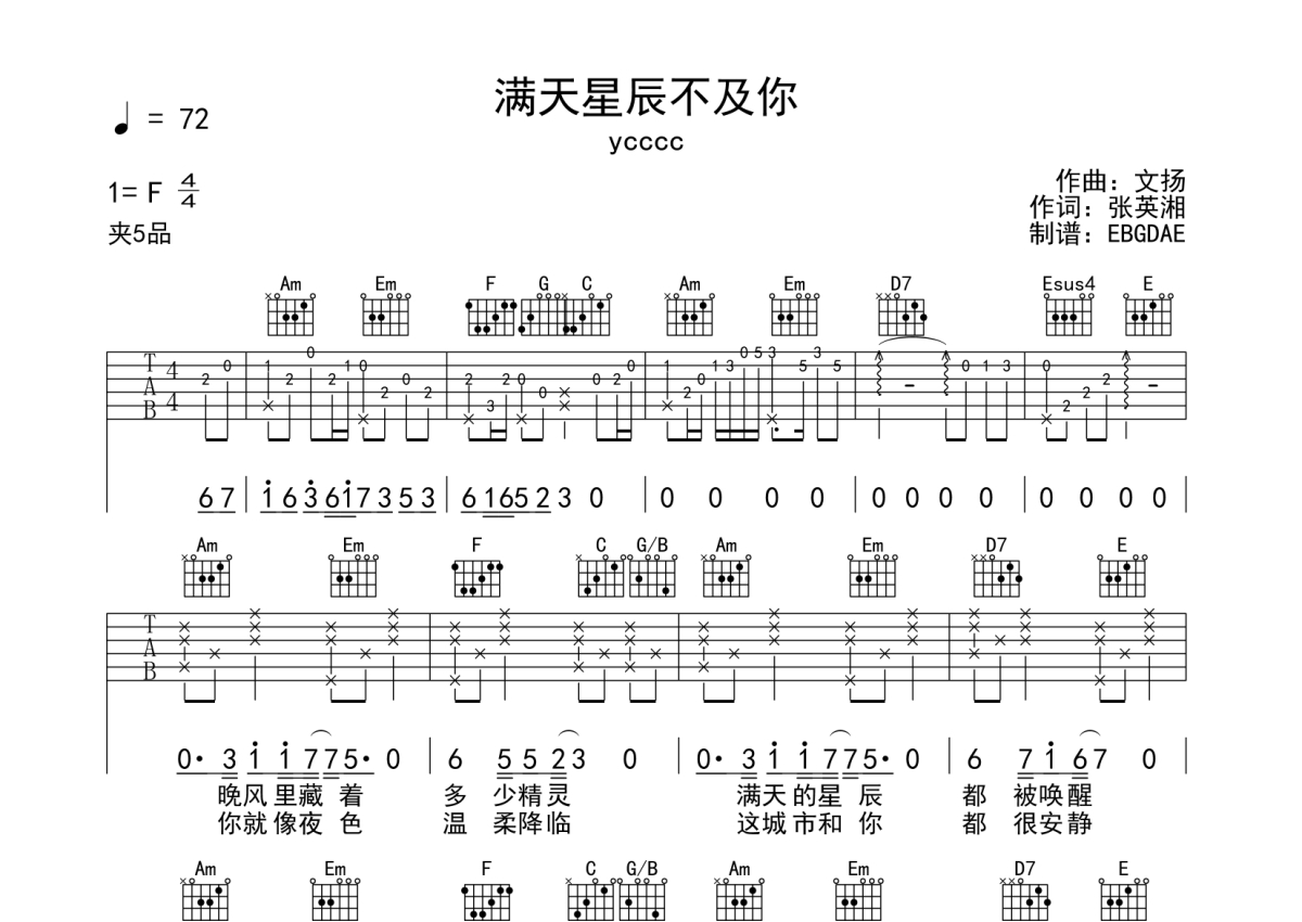 《满天星辰不及你》是ycccc演唱的一首歌曲,本吉他谱采用的是C调指法编配,这份吉他谱共有两张高清图谱,图谱由 @EBGDAE 编配上传,图谱使用六线谱编配,包含吉他和弦指法、简谱以及歌词部分,曲谱配备了相关的音频提供试听,使用这份满天星辰不及你吉他谱,可以让你更加方便地掌握这首歌曲的弹唱技巧,快来尝试吧。2张谱,免翻页排版设计。物美价廉,放心选购!加油!。