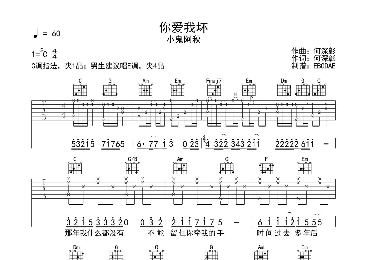 小鬼阿秋《你爱我坏》吉他谱 - C调弹唱六线谱