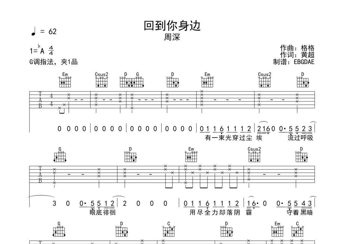 周深《回到你身边》吉他谱 - G调弹唱六线谱