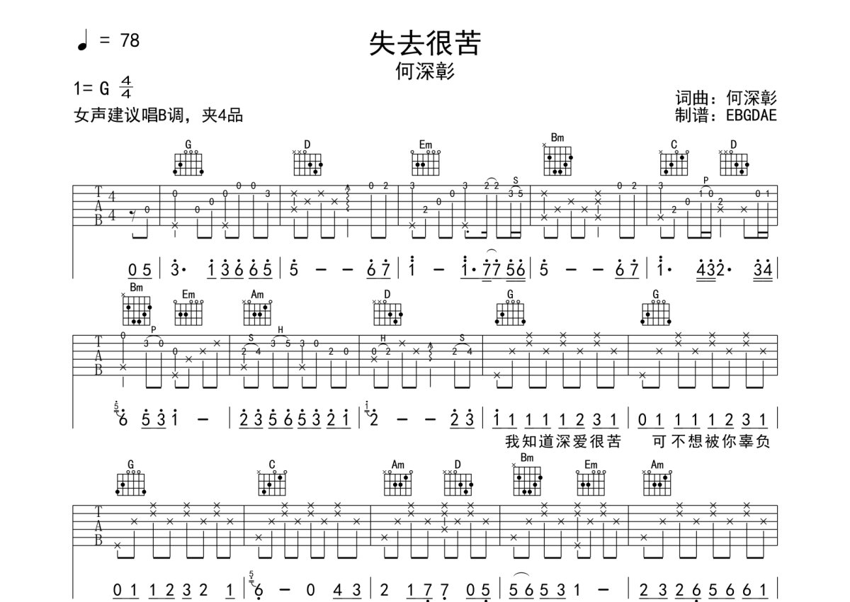 何深彰《失去很苦》吉他谱 - G调弹唱六线谱
