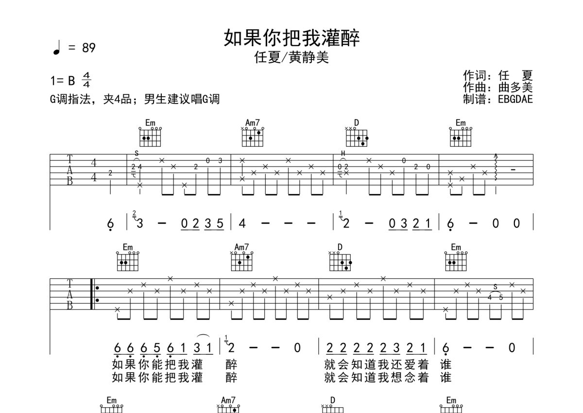 任夏/黄静美《如果你把我灌醉》吉他谱 - G调弹唱六线谱