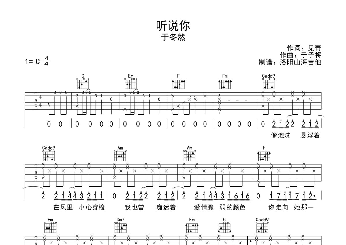 于冬然《听说你》吉他谱 - C调弹唱六线谱