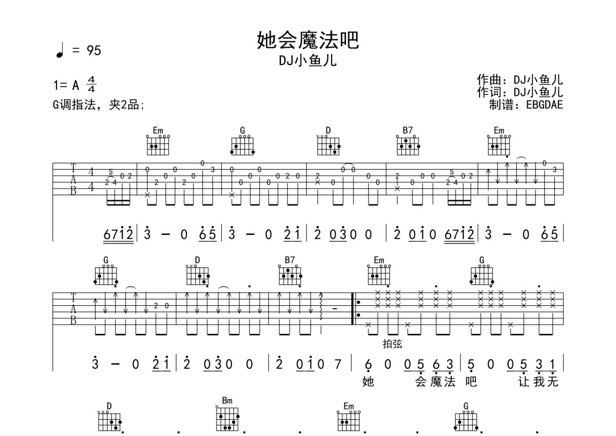 DJ小鱼儿《她会魔法吧》吉他谱 - G调弹唱六线谱