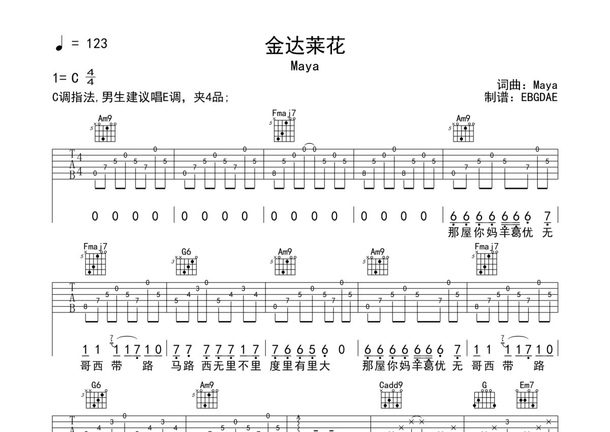 Maya《金达莱花》吉他谱 - C调弹唱六线谱