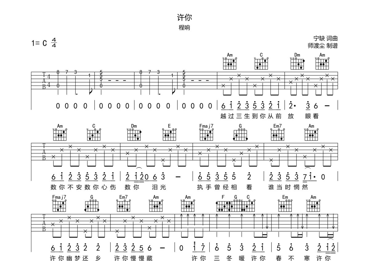 程响《许你》吉他谱 - C调弹唱六线谱
