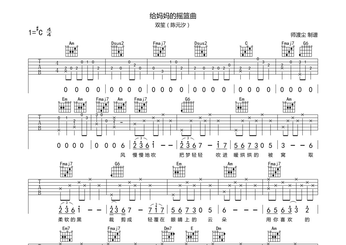 《给妈妈的摇篮曲》是双笙演唱的一首歌曲,本吉他谱采用的是C调指法编配,这份吉他谱共有两张高清图谱,图谱由 @师渡尘 编配上传,图谱使用六线谱编配,包含吉他和弦指法、简谱以及歌词部分,曲谱配备了相关的音频提供试听,使用这份给妈妈的摇篮曲吉他谱,可以让你更加方便地掌握这首歌曲的弹唱技巧,快来尝试吧。双笙《给妈妈的摇篮曲》吉他谱_C调吉他弹唱谱。