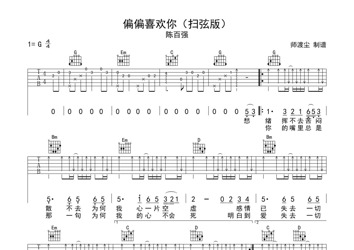 《偏偏喜欢你》是陈百强演唱的一首歌曲,扫弦版,本吉他谱采用的是G调指法编配,这份吉他谱共有两张高清图谱,图谱由 @师渡尘 编配上传,图谱使用六线谱编配,包含吉他和弦指法、简谱以及歌词部分,曲谱配备了相关的音频提供试听,使用这份偏偏喜欢你吉他谱,可以让你更加方便地掌握这首歌曲的弹唱技巧,快来尝试吧。偏偏喜欢你是陈百强最经典的一首歌曲,伊人已远去,我依然在原地。分别已久,为何我心分秒想着过去。而你却一点都没有惦记过,也许我们之间的情义已经失去,可我却为何偏偏喜欢你。我对你的爱,已是我心中的负累。入骨的相思,让我遍体鳞伤,千疮百孔。但即便如此,我却偏偏痴心想见你。本谱采用G调指法编配,纯享扫弦版4/4拍节奏,速度缓慢,简单易弹。