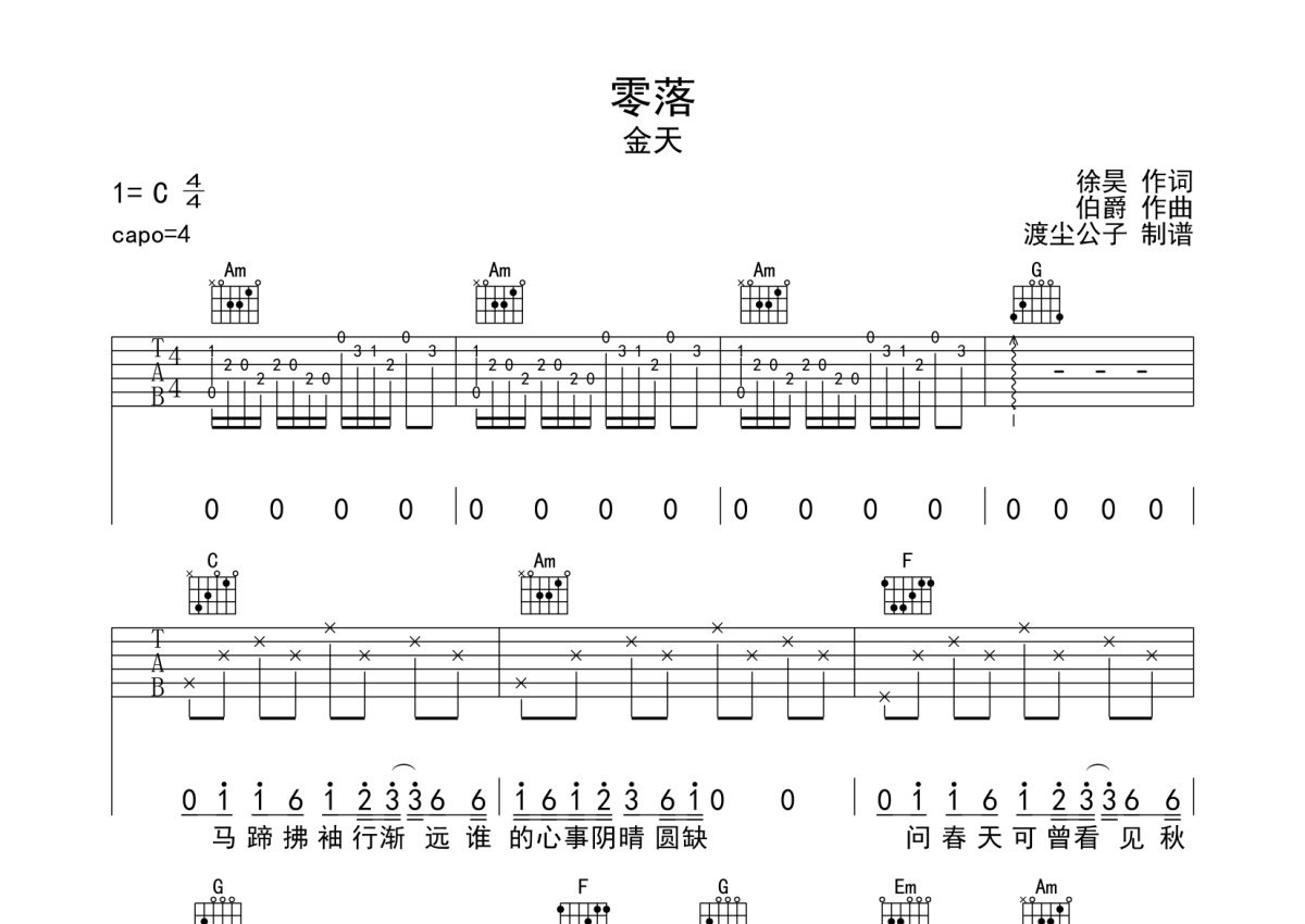 金天《零落》吉他谱 - C调弹唱六线谱