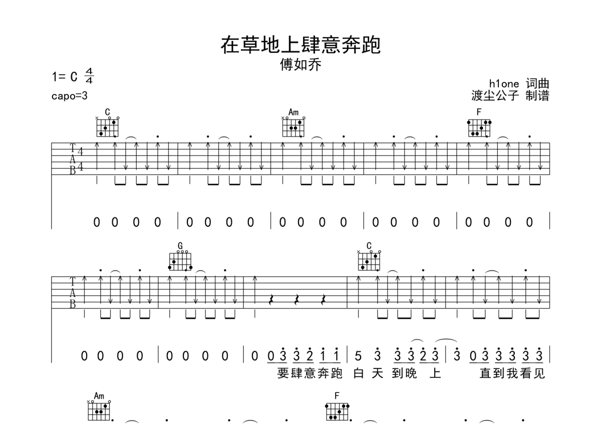 傅如乔《在草地上肆意奔跑》吉他谱 - C调弹唱六线谱