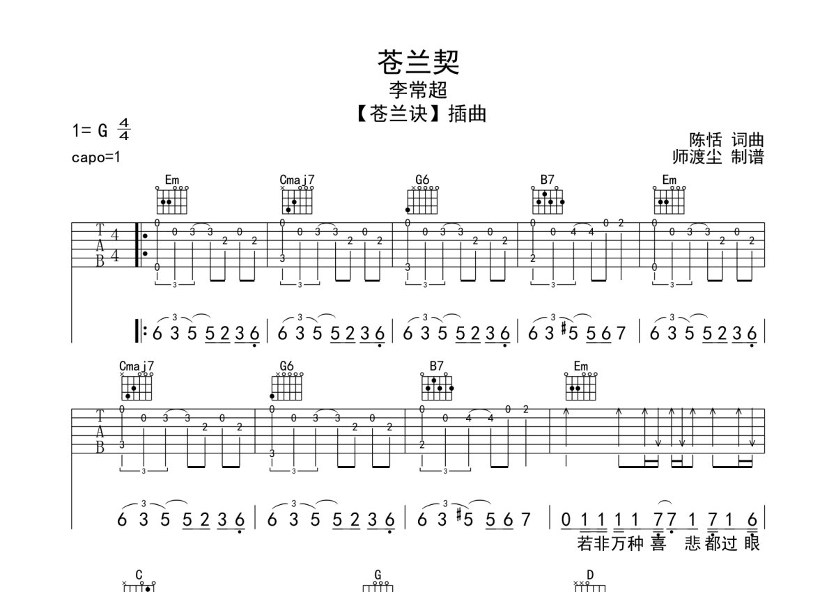 《苍兰契》是李常超演唱的一首歌曲,本吉他谱采用的是G调指法编配,这份吉他谱共有三张高清图谱,图谱由 @师渡尘 编配上传,图谱使用六线谱编配,包含吉他和弦指法、简谱以及歌词部分,使用这份苍兰契吉他谱,可以让你更加方便地掌握这首歌曲的弹唱技巧,快来尝试吧。李常超《苍兰契》吉他弹唱谱,采用G调指法编配,师渡尘编配出品,共有3张高清图谱。