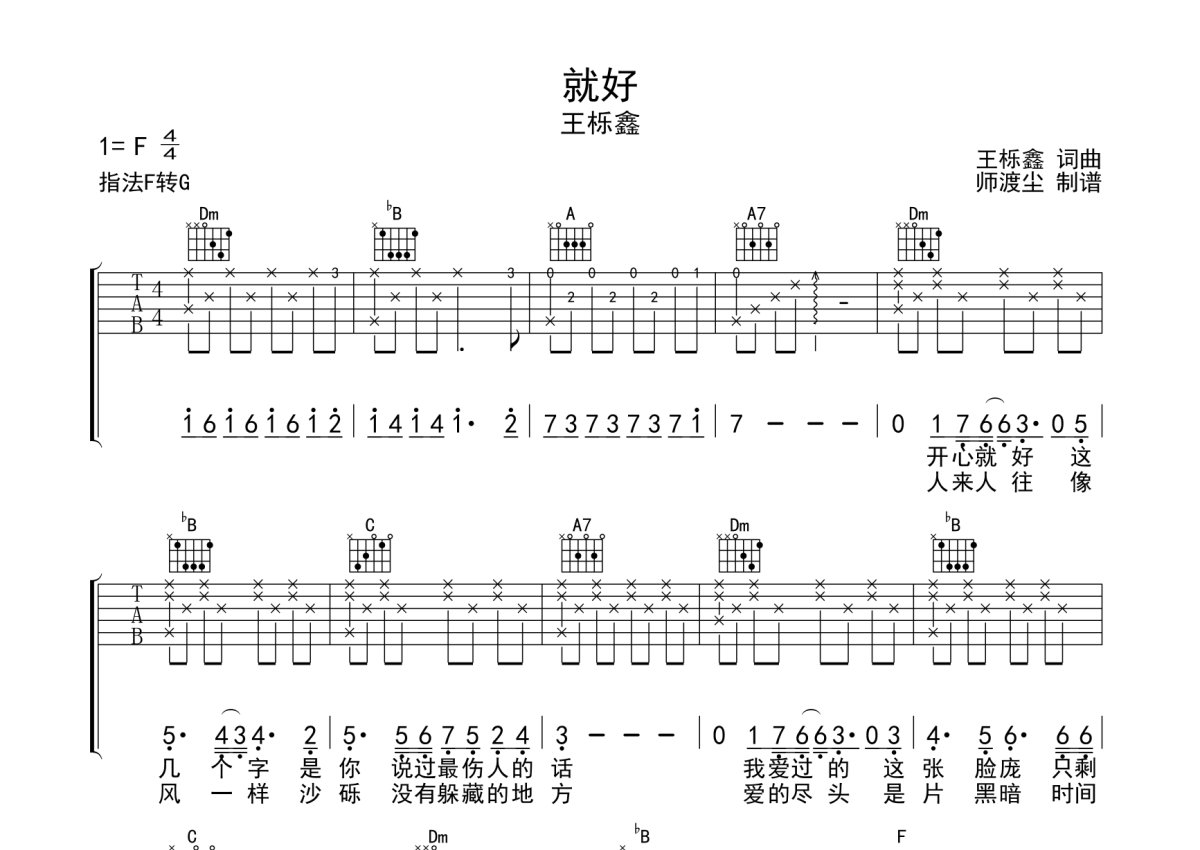 王栎鑫《就好》吉他谱 - F调弹唱六线谱