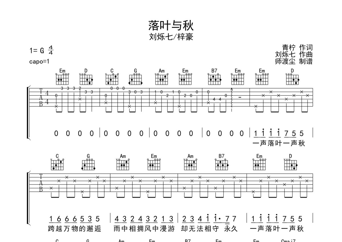 刘烁七/梓豪《落叶与秋》吉他谱 - G调弹唱六线谱