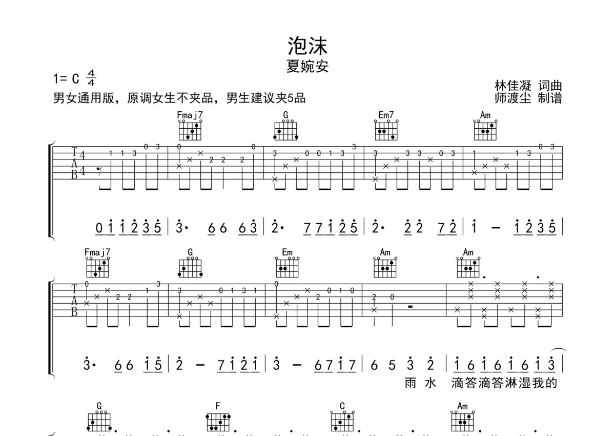 《泡沫》是夏婉安演唱的一首歌曲,男女通用版,本吉他谱采用的是C调指法编配,这份吉他谱共有三张高清图谱,图谱由 @师渡尘 编配上传,图谱使用六线谱编配,包含吉他和弦指法、简谱以及歌词部分,使用这份泡沫吉他谱,可以让你更加方便地掌握这首歌曲的弹唱技巧,快来尝试吧。夏婉安《泡沫》吉他弹唱谱,采用C调指法编配男女通用版,师渡尘编配出品,共有3张高清图谱。