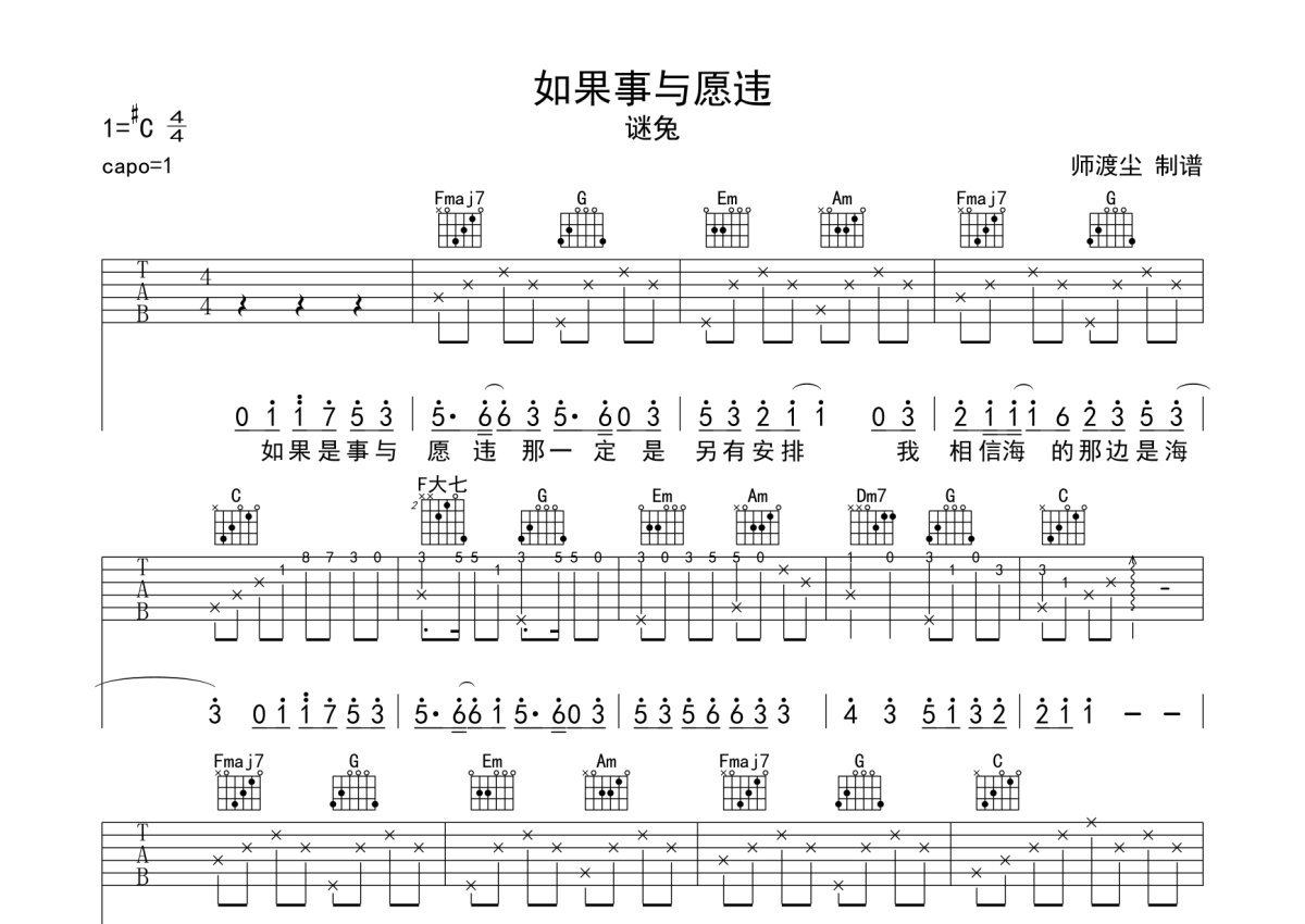 《如果事与愿违》是谜兔演唱的一首歌曲,本吉他谱采用的是C调指法编配,这份吉他谱共有两张高清图谱,图谱由 @师渡尘 编配上传,图谱使用六线谱编配,包含吉他和弦指法、简谱以及歌词部分,使用这份如果事与愿违吉他谱,可以让你更加方便地掌握这首歌曲的弹唱技巧,快来尝试吧。谜兔《如果事与愿违》吉他弹唱谱,采用C调指法编配,师渡尘编配出品,共有2张高清图谱,免翻页排版设计。