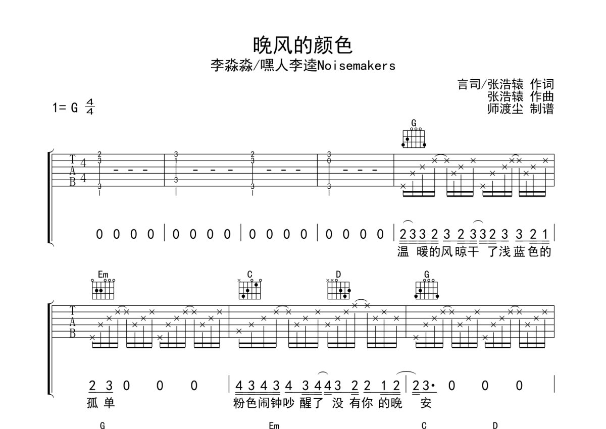 李淼淼《晚风的颜色》吉他谱 - G调弹唱六线谱
