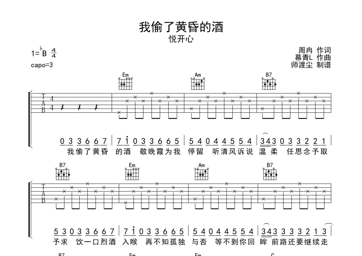 《我偷了黄昏的酒》是悦开心演唱的一首歌曲,本吉他谱采用的是G调指法编配,这份吉他谱共有三张高清图谱,图谱由 @师渡尘 编配上传,图谱使用六线谱编配,包含吉他和弦指法、简谱以及歌词部分,使用这份我偷了黄昏的酒吉他谱,可以让你更加方便地掌握这首歌曲的弹唱技巧,快来尝试吧。悦开心《我偷了黄昏的酒》吉他弹唱谱,采用G调指法编配,师渡尘编配出品,共有3张高清图谱。