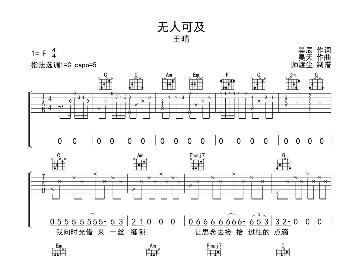 《无人可及》是王晴演唱的一首歌曲,本吉他谱采用的是C调指法编配,这份吉他谱共有三张高清图谱,图谱由 @师渡尘 编配上传,图谱使用六线谱编配,包含吉他和弦指法、简谱以及歌词部分,使用这份无人可及吉他谱,可以让你更加方便地掌握这首歌曲的弹唱技巧,快来尝试吧。王晴《无人可及》吉他弹唱谱,采用C调指法编配,师渡尘编配出品,共有3张高清图谱。