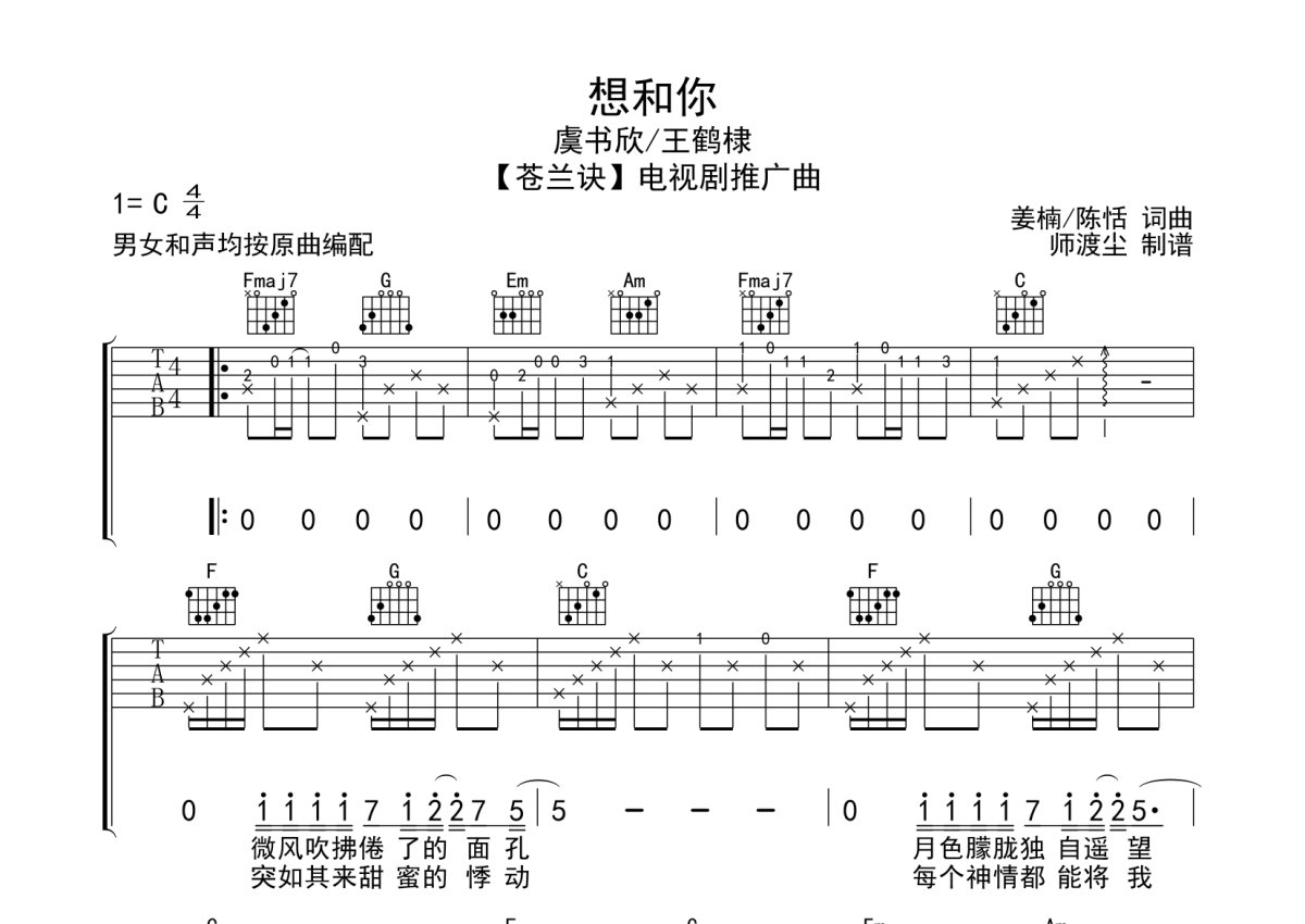 虞书欣/王鹤棣《想和你》吉他谱 - C调弹唱六线谱