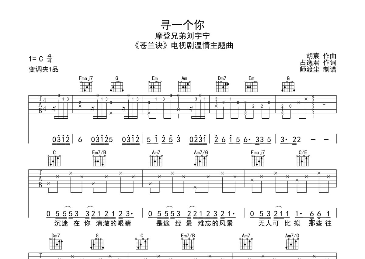 《寻一个你》是刘宇宁演唱的一首歌曲,本吉他谱采用的是C调指法编配,这份吉他谱共有两张高清图谱,图谱由 @师渡尘 编配上传,图谱使用六线谱编配,包含吉他和弦指法、简谱以及歌词部分,使用这份寻一个你吉他谱,可以让你更加方便地掌握这首歌曲的弹唱技巧,快来尝试吧。刘宇宁《寻一个你》吉他弹唱谱,采用C调指法编配,师渡尘编配出品,共有2张高清图谱,免翻页排版设计。