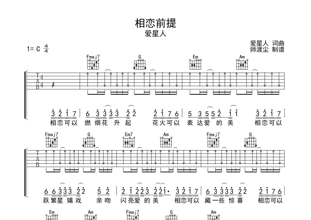 《相恋前提》是爱星人演唱的一首歌曲,本吉他谱采用的是C调指法编配,这份吉他谱共有四张高清图谱,图谱由 @师渡尘 编配上传,图谱使用六线谱编配,包含吉他和弦指法、简谱以及歌词部分,使用这份相恋前提吉他谱,可以让你更加方便地掌握这首歌曲的弹唱技巧,快来尝试吧。相恋前提吉他谱,来自@师渡尘编配扒谱制作,本吉他谱采用C调和弦指法编配,推荐变调夹夹第1品演奏,原调#C调,也可以根据个人嗓音条件灵活选择变调夹位置,演奏的速度控制在每分钟100拍左右,演奏难度简单。右手采用扫弦及切弦。