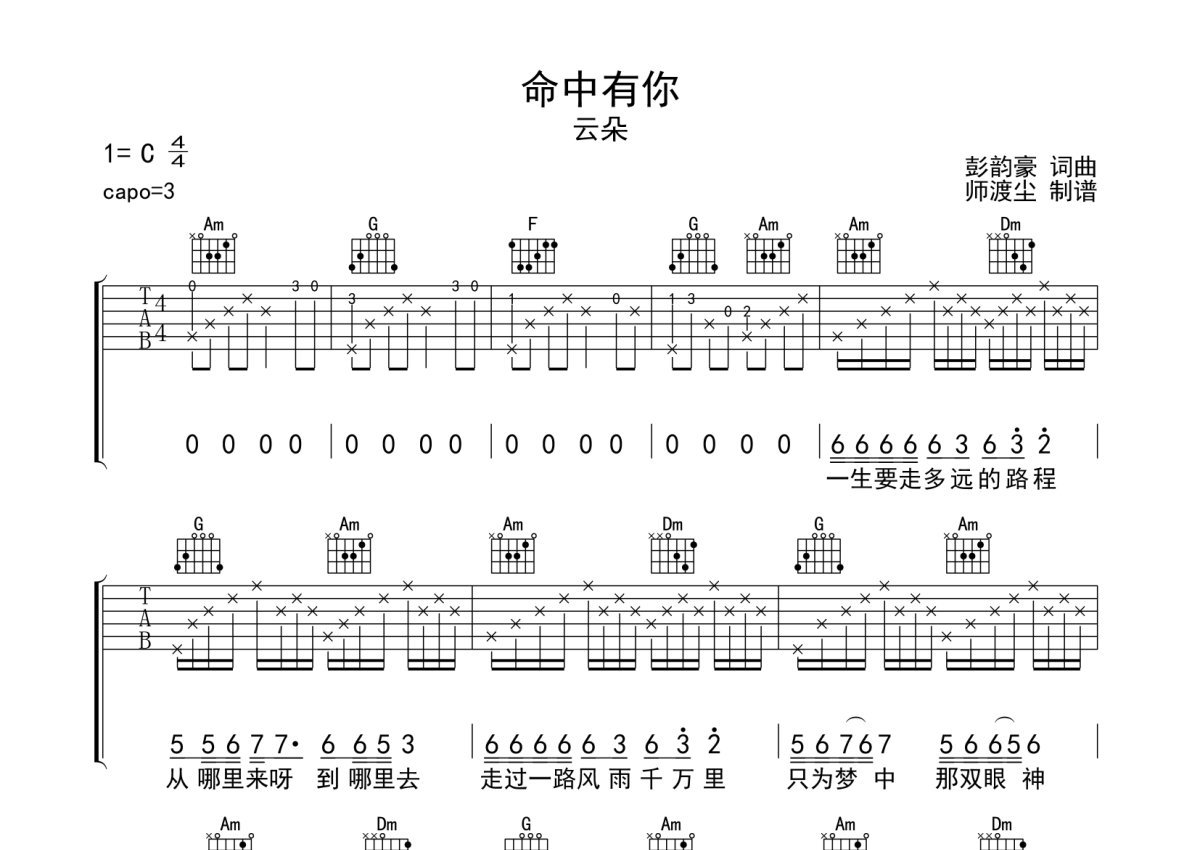 《命中有你》是云朵演唱的一首歌曲,本吉他谱采用的是C调指法编配,这份吉他谱共有两张高清图谱,图谱由 @师渡尘 编配上传,图谱使用六线谱编配,包含吉他和弦指法、简谱以及歌词部分,使用这份命中有你吉他谱,可以让你更加方便地掌握这首歌曲的弹唱技巧,快来尝试吧。云朵《命中有你》吉他弹唱谱,采用C调指法编配,师渡尘编配出品,共有2张高清图谱,免翻页排版设计。