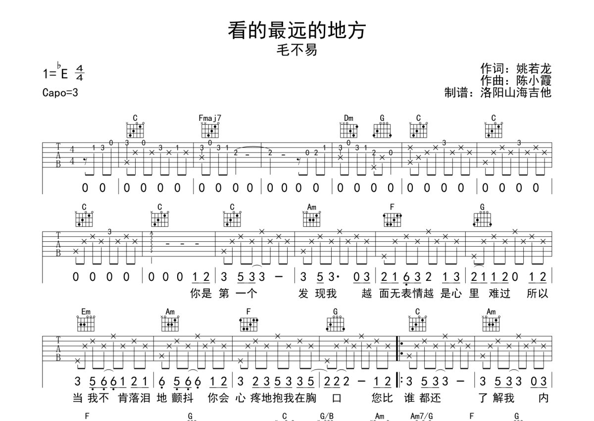 毛不易《看的最远的地方》吉他谱 - C调弹唱六线谱