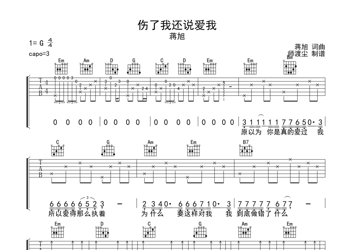 蒋旭《伤了我还说爱我》吉他谱 - G调弹唱六线谱