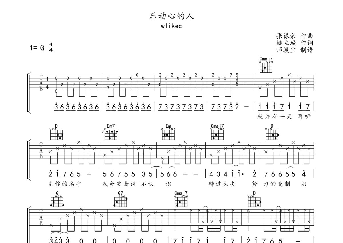 wlikec《后动心的人》吉他谱 - G调弹唱六线谱