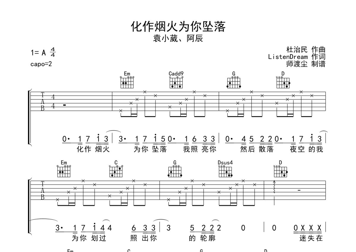 《化作烟火为你坠落》是袁小葳/阿辰演唱的一首歌曲,本吉他谱采用的是G调指法编配,这份吉他谱共有两张高清图谱,图谱由 @师渡尘 编配上传,图谱使用六线谱编配,包含吉他和弦指法、简谱以及歌词部分,使用这份化作烟火为你坠落吉他谱,可以让你更加方便地掌握这首歌曲的弹唱技巧,快来尝试吧。袁小葳/阿辰《化作烟火为你坠落》吉他弹唱谱,采用G调指法编配,师渡尘编配出品,共有2张高清图谱,免翻页排版设计。