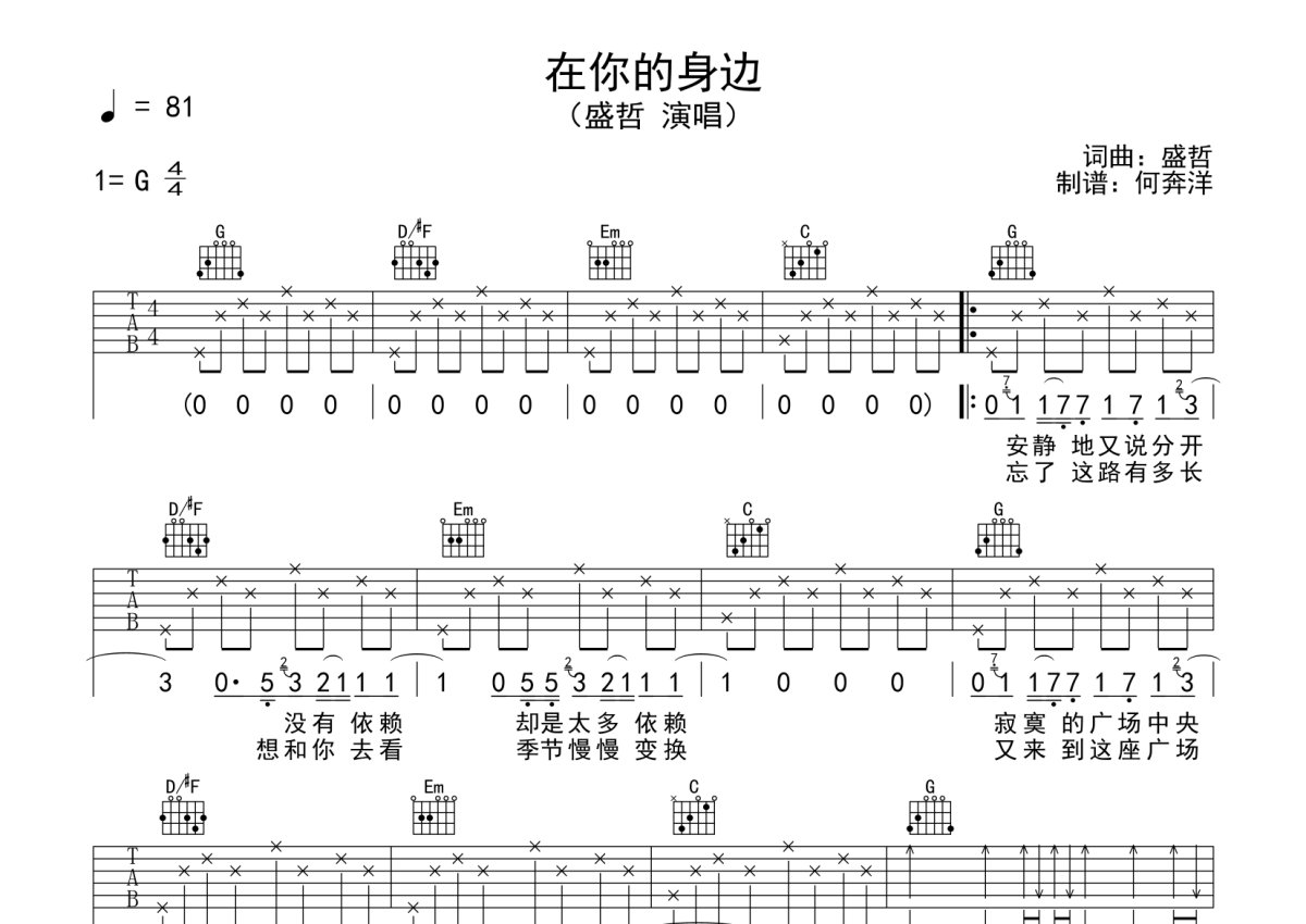 盛哲《在你的身边》吉他谱 - G调弹唱六线谱