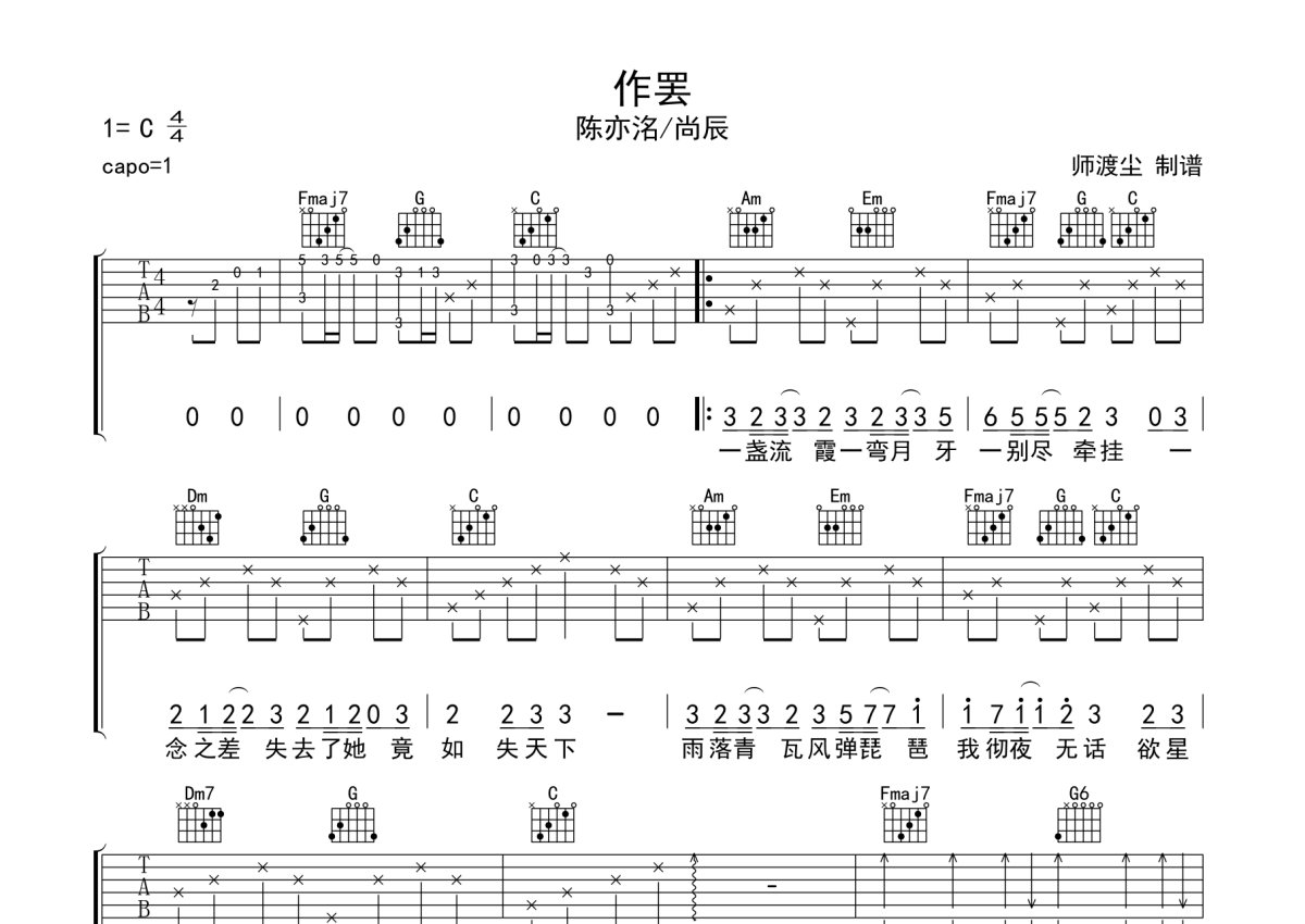 陈亦洺《作罢》吉他谱 - C调弹唱六线谱
