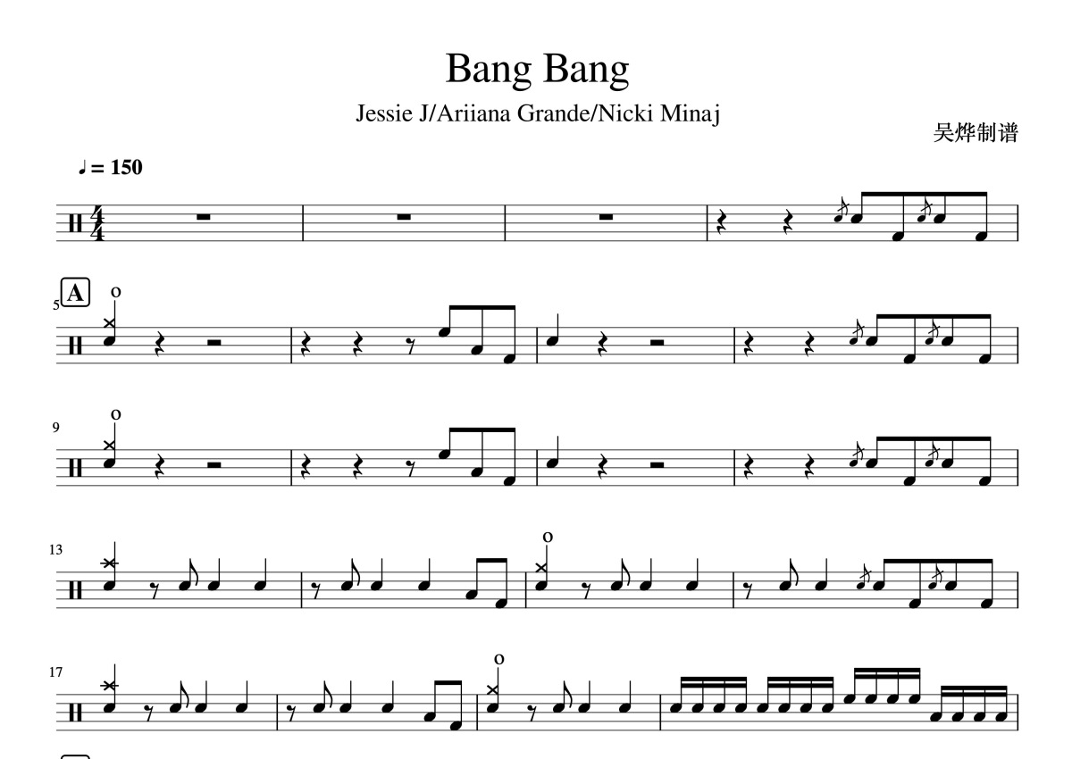 《Bang Bang》是Jessie J / Ariana Grande / Nicki Minaj演唱的一首歌曲,这份鼓谱共有三张高清图谱,图谱由 @鼓谱_wuye 编配上传,图谱使用五线谱编配,使用这份Bang Bang架子鼓谱,你将能够轻松地敲打出这首Jessie J / Ariana Grande / Nicki Minaj的Bang Bang,快来尝试吧。JessieJ/ArianaGrande/NickiMinaj《BangBang》架子鼓谱,吴烨编配出品,共有3张高清图谱。