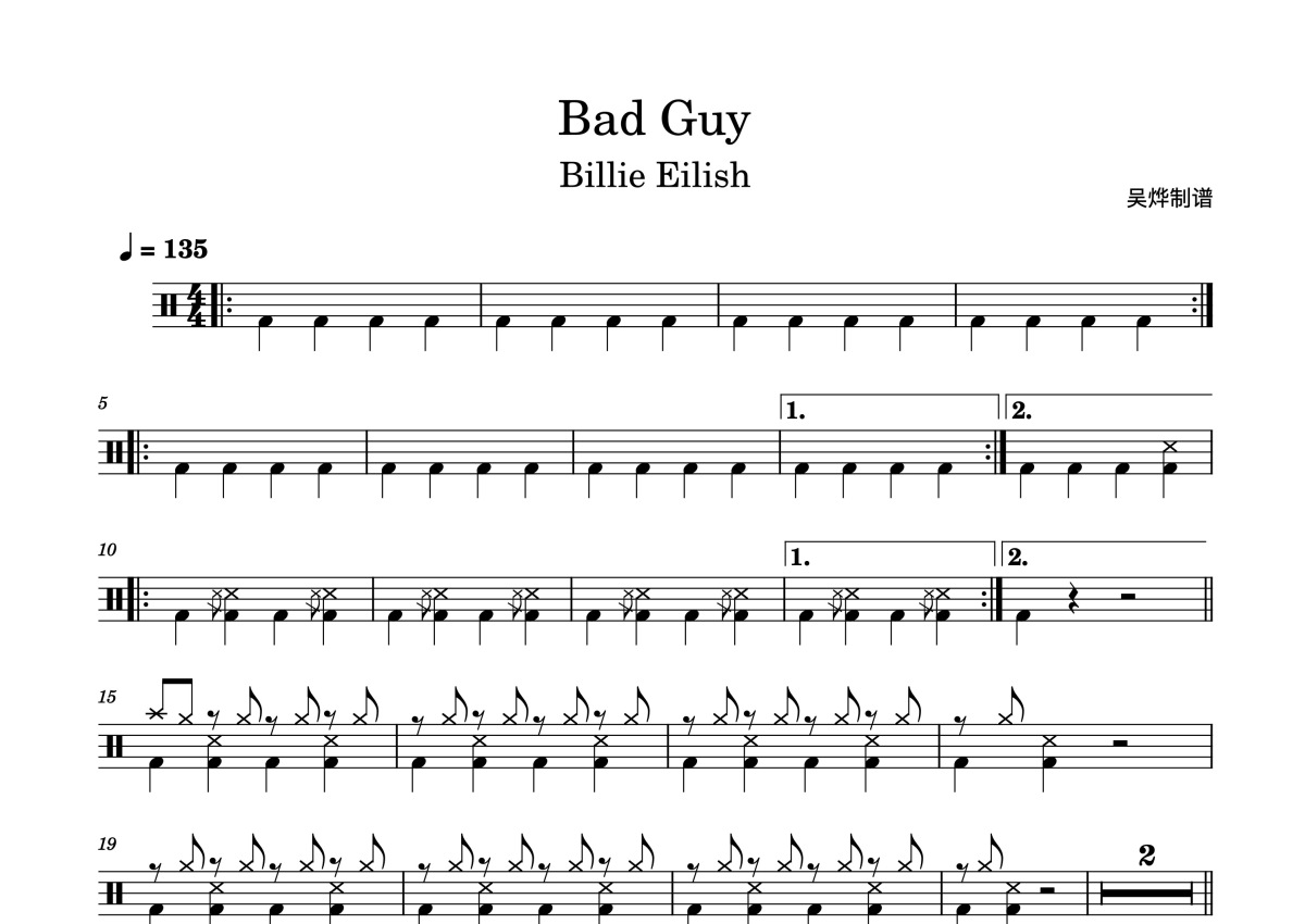 Billie Eilish《Bad Guy》鼓谱 - 架子鼓谱