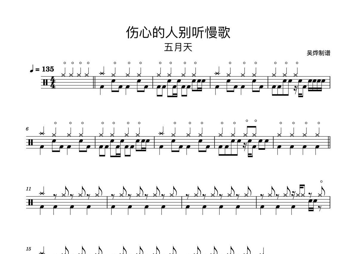 《伤心的人别听慢歌》是五月天演唱的一首歌曲,这份鼓谱共有四张高清图谱,图谱由 @鼓谱_wuye 编配上传,图谱使用五线谱编配,使用这份伤心的人别听慢歌架子鼓谱,你将能够轻松地敲打出这首五月天的伤心的人别听慢歌,快来尝试吧。五月天《伤心的人别听慢歌》架子鼓谱,吴烨编配出品,共有4张高清图谱。