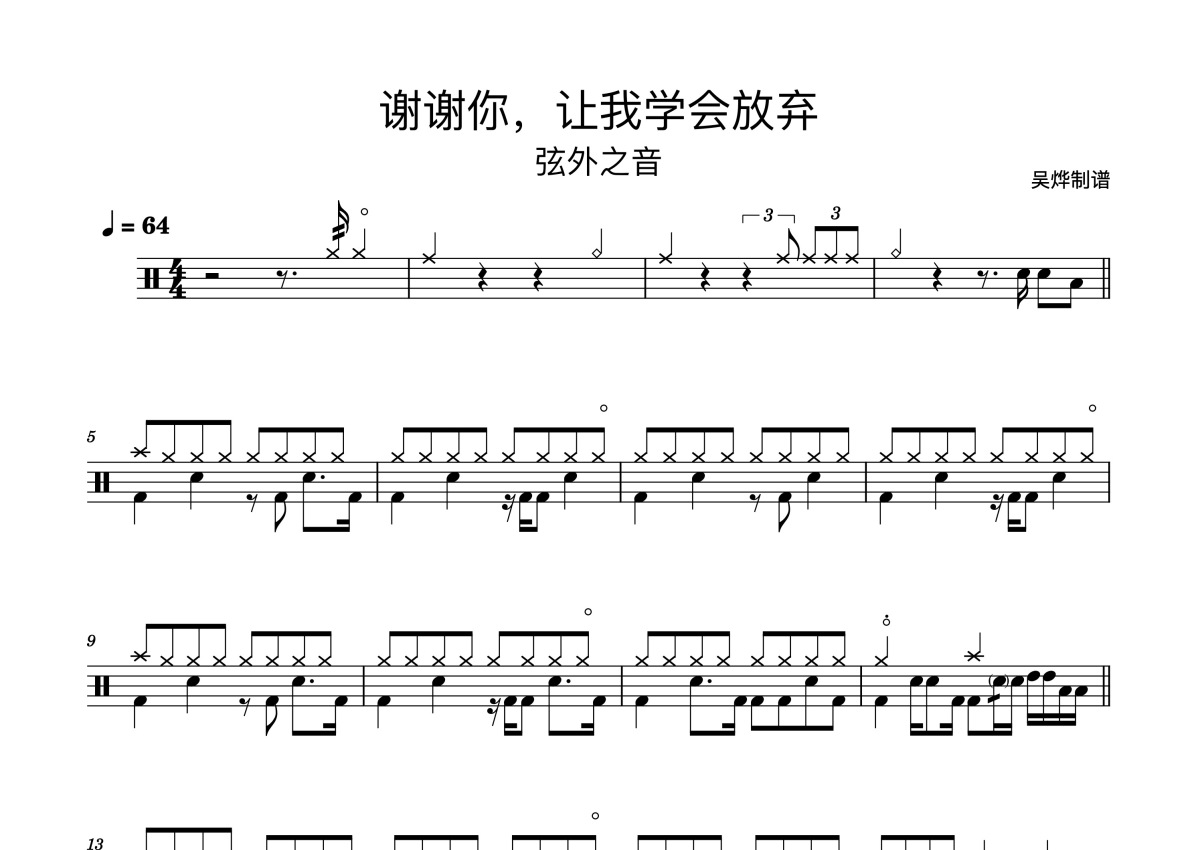 《谢谢你,让我学会放弃》是弦外之音演唱的一首歌曲,这份鼓谱共有两张高清图谱,图谱由 @鼓谱_wuye 编配上传,图谱使用五线谱编配,使用这份谢谢你,让我学会放弃架子鼓谱,你将能够轻松地敲打出这首弦外之音的谢谢你,让我学会放弃,快来尝试吧。弦外之音《谢谢你,让我学会放弃》架子鼓谱,吴烨编配出品,共有2张高清图谱,免翻页排版设计。
