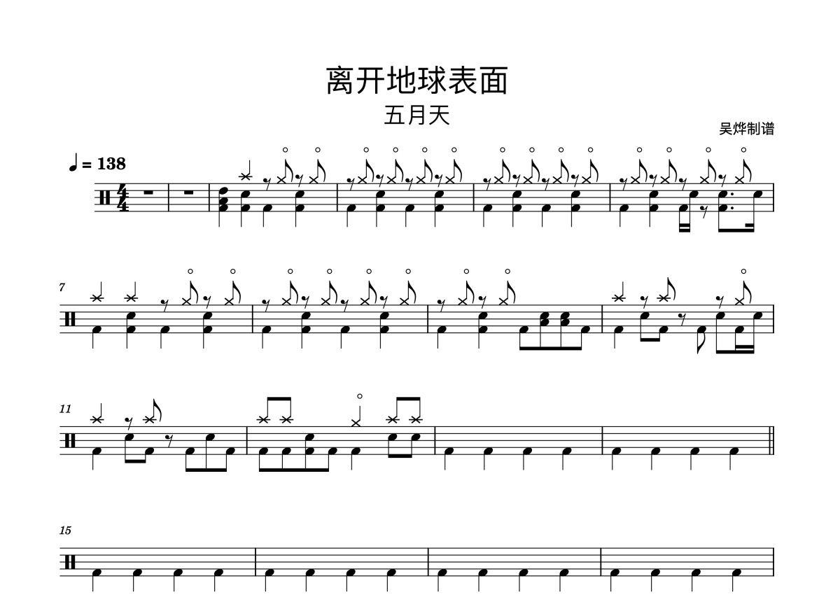 《离开地球表面》是五月天演唱的一首歌曲,这份鼓谱共有五张高清图谱,图谱由 @鼓谱_wuye 编配上传,图谱使用五线谱编配,使用这份离开地球表面架子鼓谱,你将能够轻松地敲打出这首五月天的离开地球表面,快来尝试吧。五月天《离开地球表面》架子鼓谱,吴烨编配出品,共有5张高清图谱。