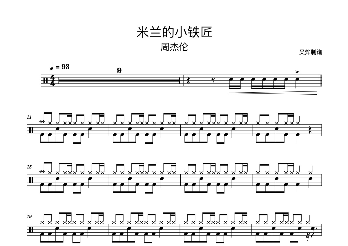 《米兰的小铁匠》是周杰伦演唱的一首歌曲,这份鼓谱共有两张高清图谱,图谱由 @鼓谱_wuye 编配上传,图谱使用五线谱编配,使用这份米兰的小铁匠架子鼓谱,你将能够轻松地敲打出这首周杰伦的米兰的小铁匠,快来尝试吧。周杰伦《米兰的小铁匠》架子鼓谱,吴烨编配出品,共有2张高清图谱,免翻页排版设计。