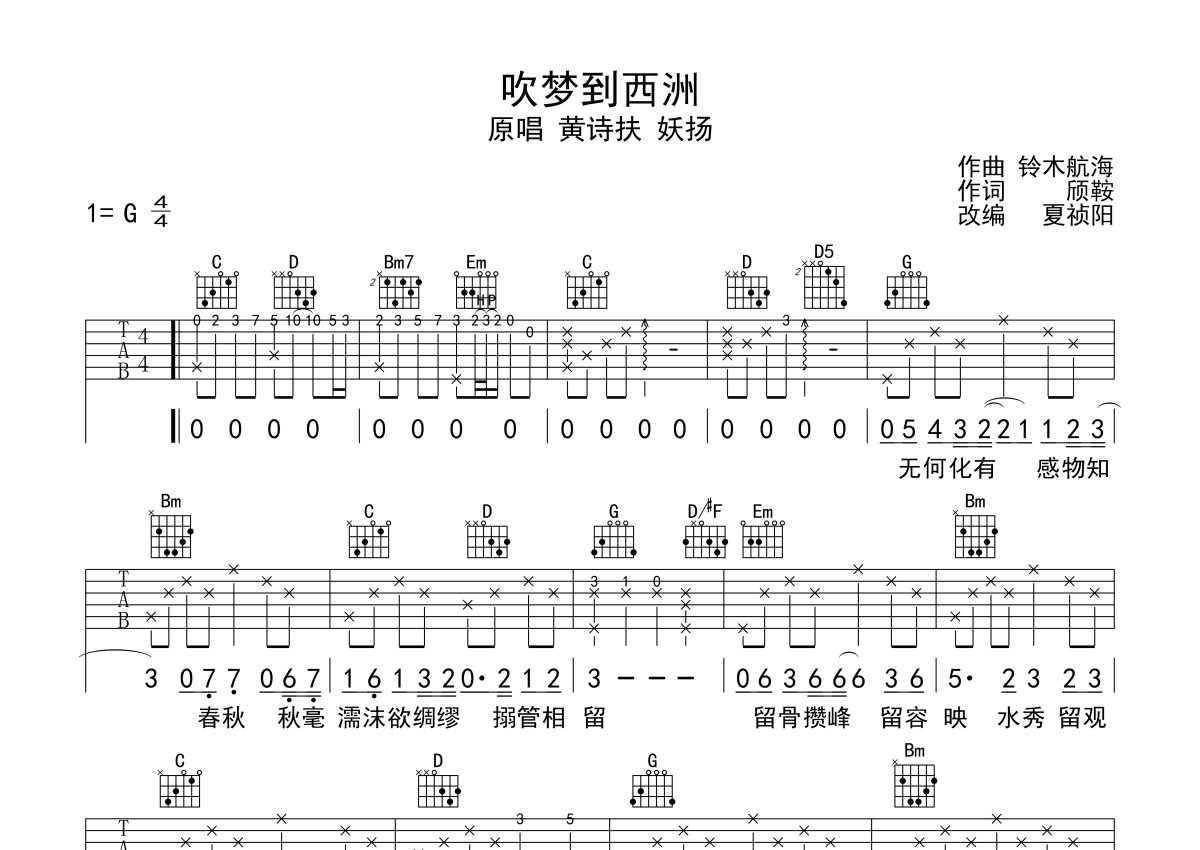 黄诗扶/妖扬《吹梦到西洲》吉他谱 - G调弹唱六线谱