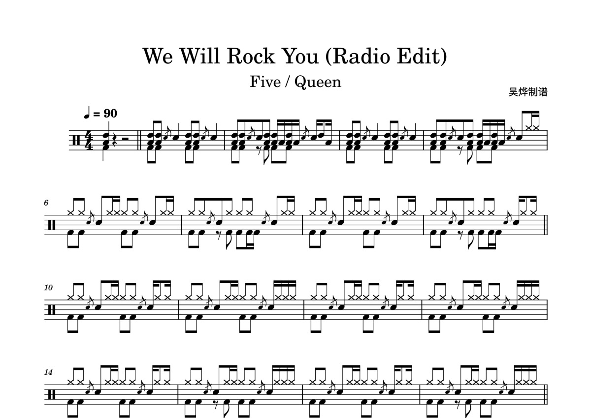 《We Will Rock You(Radio Edit)》是Five/Queen演唱的一首歌曲,这份鼓谱共有两张高清图谱,图谱由 @鼓谱_wuye 编配上传,图谱使用五线谱编配,使用这份We Will Rock You(Radio Edit)架子鼓谱,你将能够轻松地敲打出这首Five/Queen的We Will Rock You(Radio Edit),快来尝试吧。Five/Queen《WeWillRockYou(RadioEdit)》架子鼓谱,吴烨编配出品,共有2张高清图谱,免翻页排版设计。