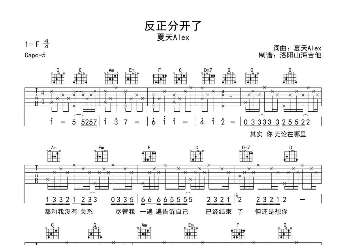 夏天Alex《反正分开了》吉他谱 - G调弹唱六线谱