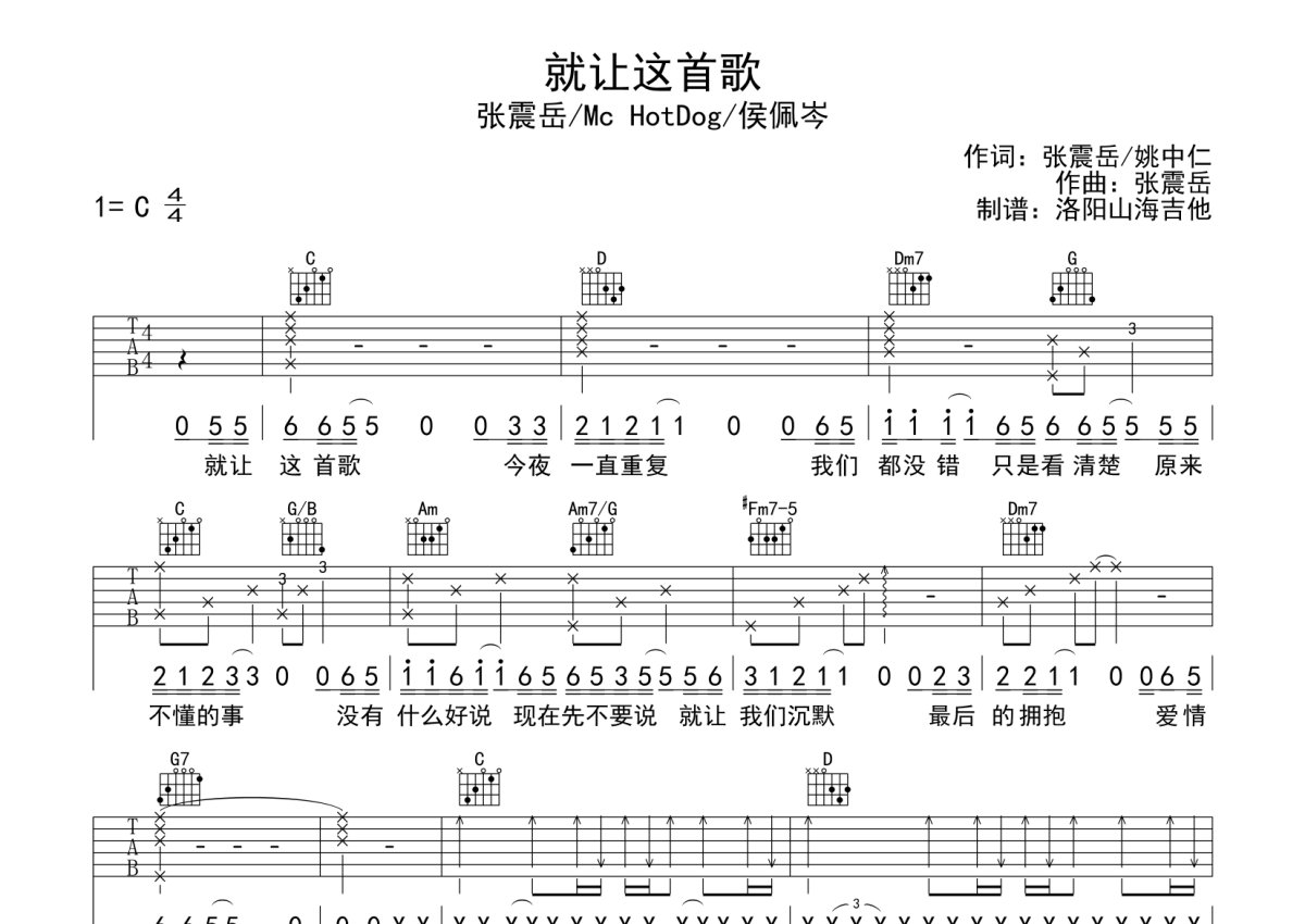 《就让这首歌》是张震岳演唱的一首歌曲,本吉他谱采用的是C调指法编配,这份吉他谱共有四张高清图谱,图谱由 @何奔洋 编配上传,图谱使用六线谱编配,包含吉他和弦指法、简谱以及歌词部分,使用这份就让这首歌吉他谱,可以让你更加方便地掌握这首歌曲的弹唱技巧,快来尝试吧。