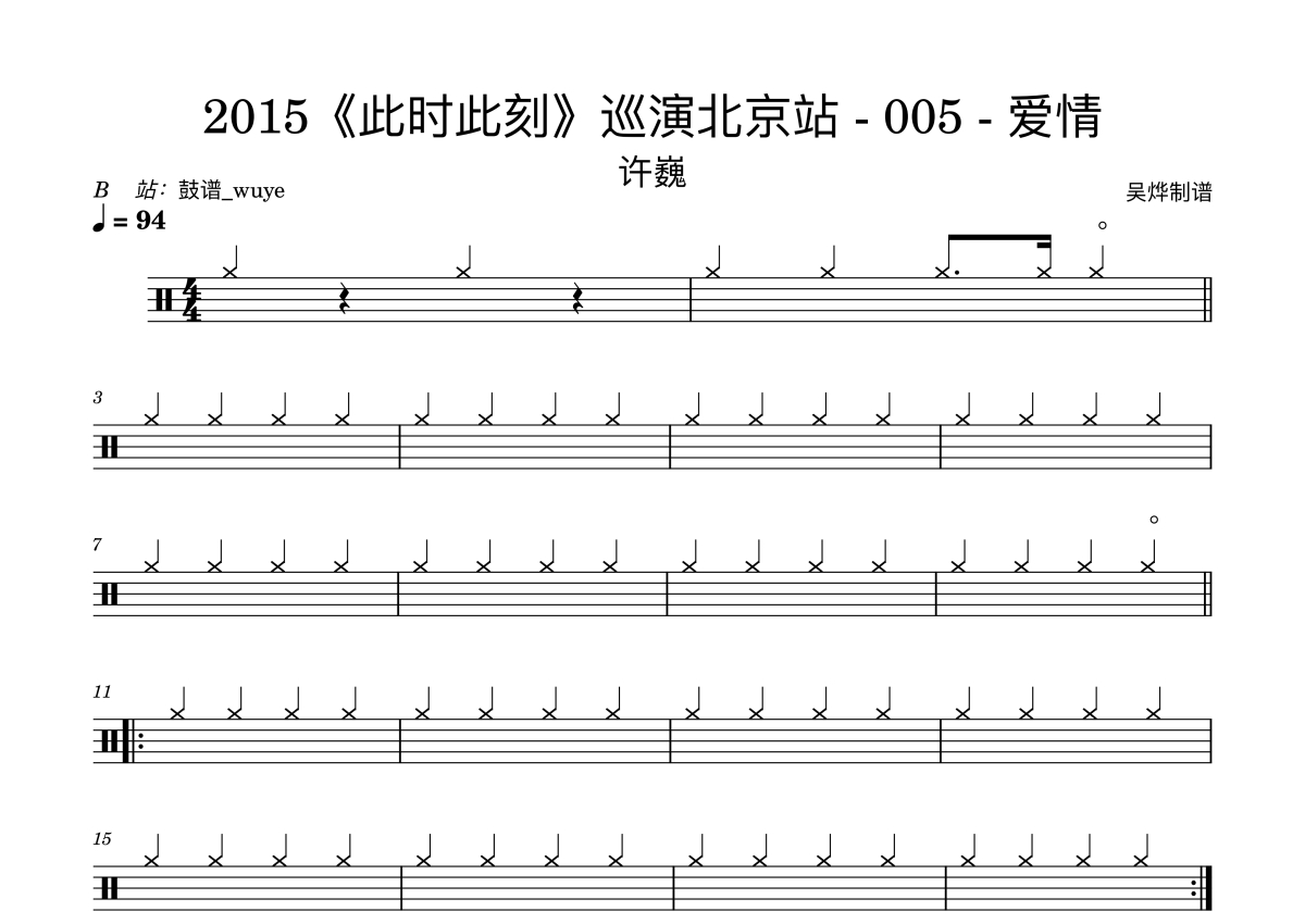 《爱情》是许巍演唱的一首歌曲,LIVE,这份鼓谱共有三张高清图谱,图谱由 @鼓谱_wuye 编配上传,图谱使用五线谱编配,使用这份爱情架子鼓谱,你将能够轻松地敲打出这首许巍的爱情,快来尝试吧。《爱情》许巍-2015“此时此刻”巡演北京站005 演唱会。