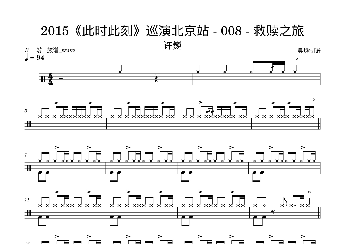 《救赎之旅》是许巍演唱的一首歌曲,LIVE,这份鼓谱共有四张高清图谱,图谱由 @鼓谱_wuye 编配上传,图谱使用五线谱编配,使用这份救赎之旅架子鼓谱,你将能够轻松地敲打出这首许巍的救赎之旅,快来尝试吧。《救赎之旅》许巍-2015“此时此刻”巡演北京站008。