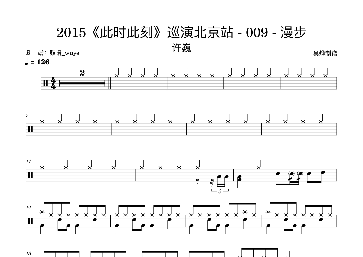 《漫步》是许巍演唱的一首歌曲,LIVE,这份鼓谱共有四张高清图谱,图谱由 @鼓谱_wuye 编配上传,图谱使用五线谱编配,使用这份漫步架子鼓谱,你将能够轻松地敲打出这首许巍的漫步,快来尝试吧。《漫步》许巍-2015“此时此刻”巡演北京站009 演唱会。