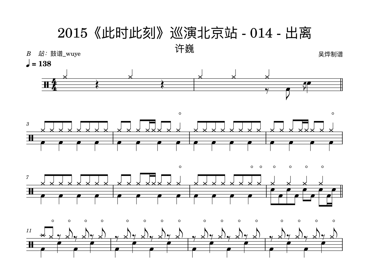 《出离》是许巍演唱的一首歌曲,LIVE,这份鼓谱共有四张高清图谱,图谱由 @鼓谱_wuye 编配上传,图谱使用五线谱编配,使用这份出离架子鼓谱,你将能够轻松地敲打出这首许巍的出离,快来尝试吧。《出离》许巍-2015“此时此刻”巡演北京站014 演唱会。