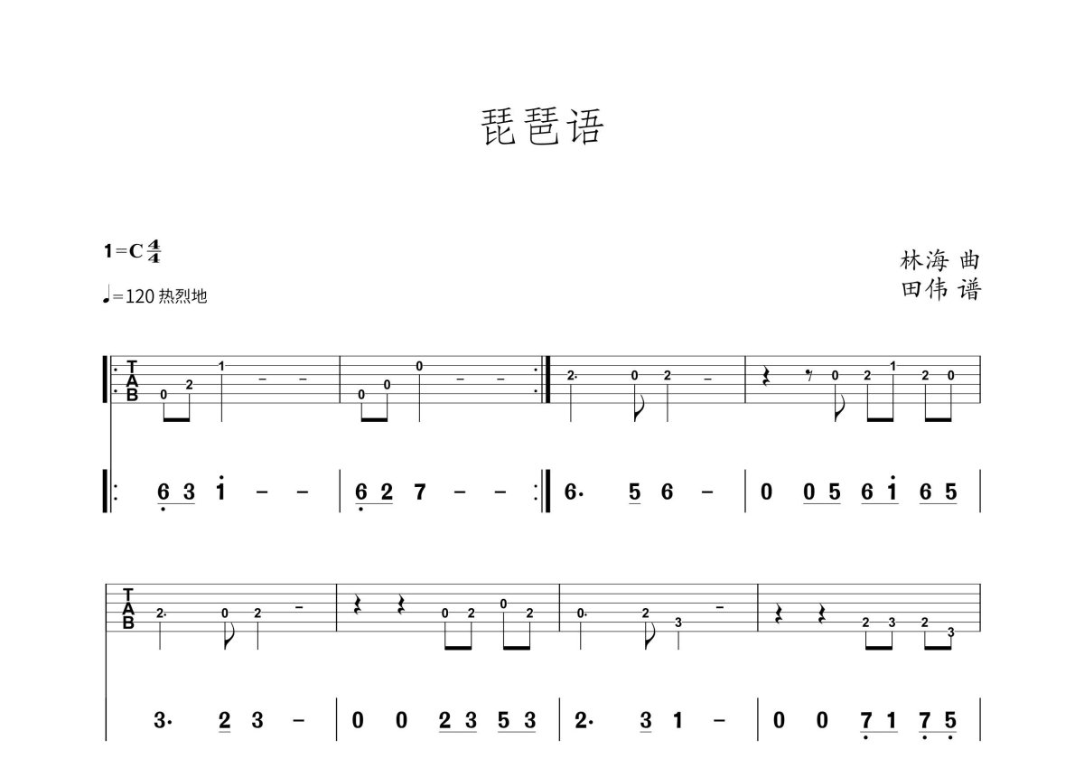 《琵琶语》是林海演唱的一首歌曲,本吉他谱采用的是C调指法编配,这份吉他谱共有两张高清图谱,图谱由 @田伟制谱工作室 编配上传,图谱使用六线谱编配,使用这份琵琶语吉他谱,可以让你更加方便地掌握这首歌曲的演奏技巧,快来尝试吧。林海《琵琶语》吉他独奏谱,采用C调指法编配,田伟编配出品,共有2张高清图谱,免翻页排版设计。