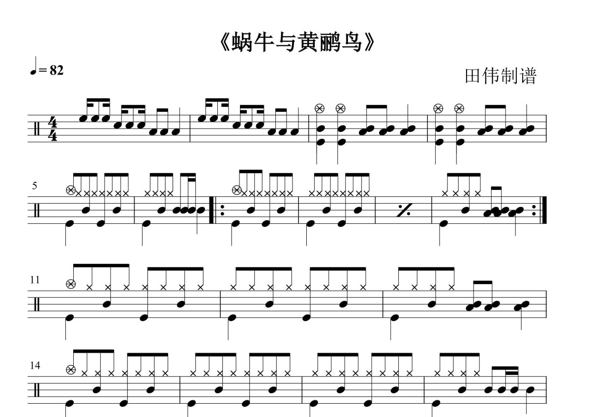 《蜗牛与黄鹂鸟》是吴淑敏演唱的一首歌曲,这份鼓谱共有一张高清图谱,图谱由 @田伟制谱工作室 编配上传,图谱使用五线谱编配,使用这份蜗牛与黄鹂鸟架子鼓谱,你将能够轻松地敲打出这首吴淑敏的蜗牛与黄鹂鸟,快来尝试吧。吴淑敏《蜗牛与黄鹂鸟》架子鼓谱,田伟编配出品,共有1张高清图谱,免翻页排版设计。